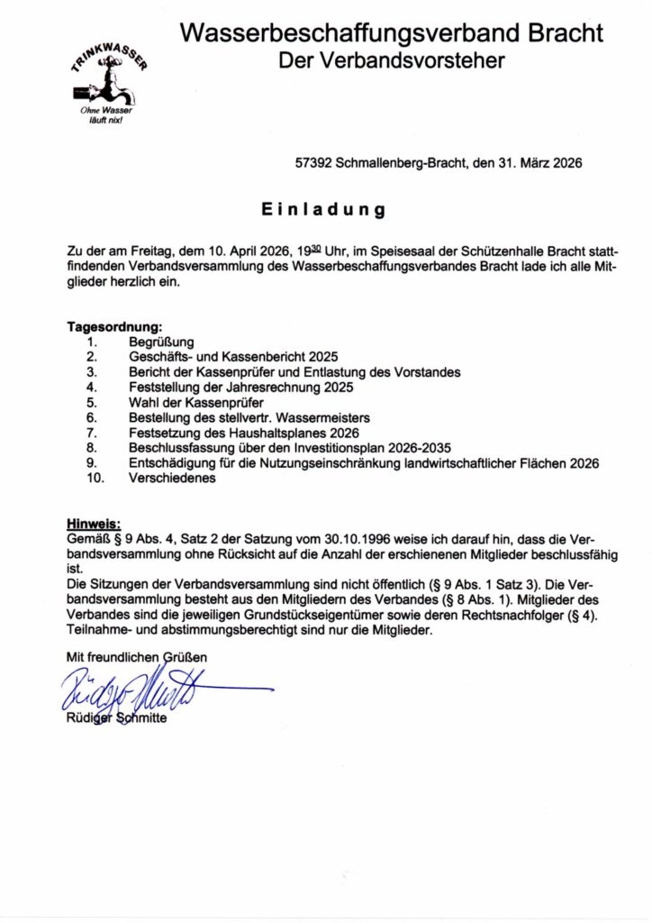 Einladung: zu der am Freitag, dem 10. April 2026, 19:30 Uhr, im Speisesaal der Schützenhalle Bracht stattfindenden Verbandsversammlung des Wasserbeschaffungsverbandes Bracht lade ich alle Mitglieder herzlich ein.